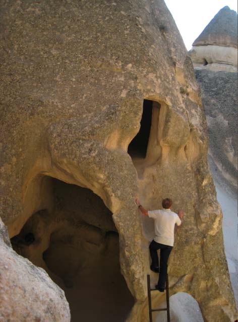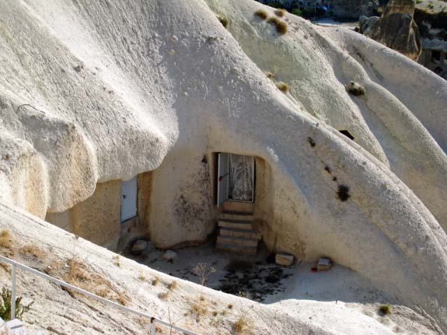 October 8/08 When you live amid a landscape composed primarily of porous volcanic tufa, it doesn’t take long before you realize, “Hey, I could make a great house out of this stuff." | In fact many hotels, restaurants and pensions in Goreme are hollowed out of the rock. Some of the resort hotels are very high-class and expensive. |