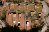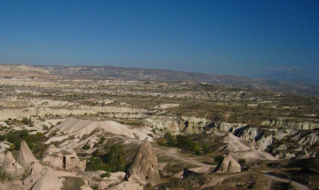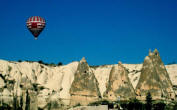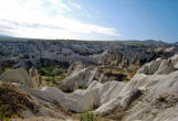 Goreme After the rather monotonous drive the last 200 miles before Goreme, we descended into a large valley with its limestone "sand dunes" and strange conical shaped spires, speckled with holes cut into the rock. |